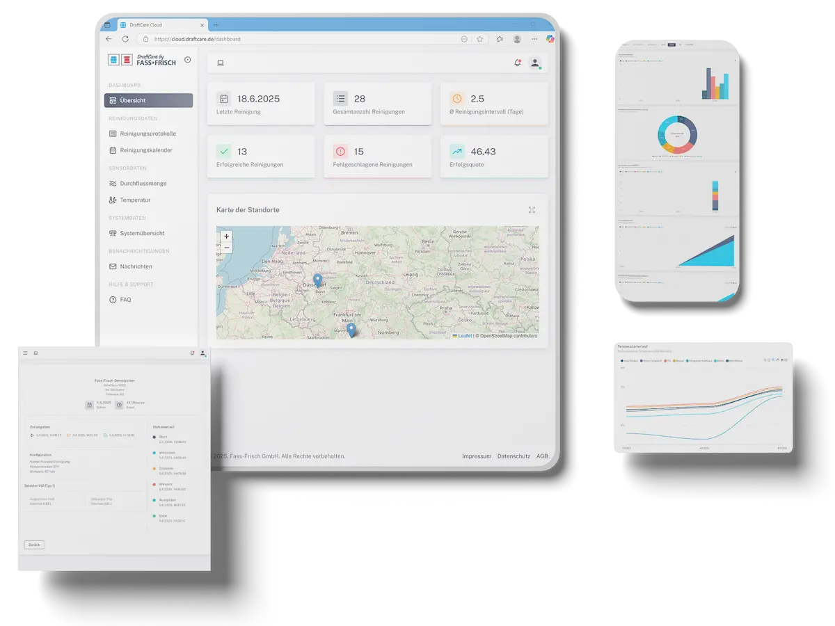 Die DraftCare Cloud zeigt Ihnen in Echtzeit, was in Ihren Schankanlagen passiert. Reinigungsvorgänge werden automatisch protokolliert, Fehler sofort gemeldet.